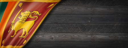 Sri Lanka flag on black wood wall. Horizontal panoramic banner.