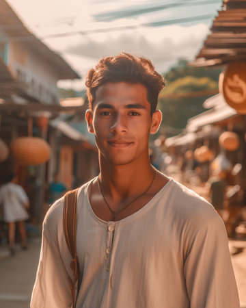 A joyful male resident of Asia, wearing a simple tank top, smiles brightly against a backdrop of rustic, colorful architecture. His natural charm radiates happiness. AI