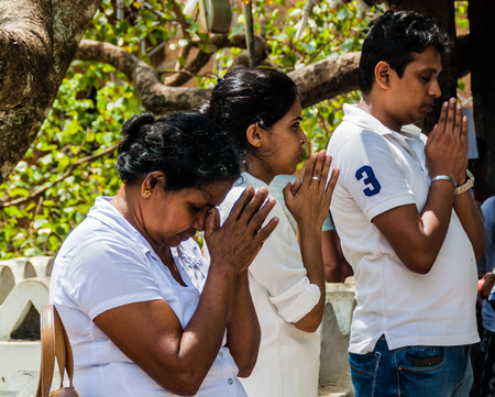 KANDY, SRI LANKA - JULY 19, 2016: White clothed buddhist pilgrims pray at Wel Bodiya with Bodhi tree during Poya (Full Moon) holiday in Kandy, Sri Lanka