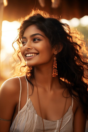 Portrait of beautiful smiling indian woman with curly hair at golden hour AI Generated