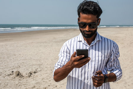 Portrait of beautiful young Indian man businessman standing at beach near ocean, holding smartphone, looking at screen.