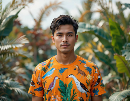 Expressive gay man with floral shirt strikes playful pose amidst rich plants. Confidence radiates as he touches voluminous hair, his gaze strong. Ideal for themes of LGBTQ pride, fashion.