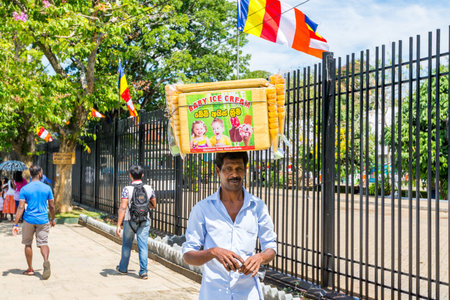 A man with a basket full of icecream on the head walking outside of the shrine of Sri Dalada Maligawa or the Temple of the Sacred Tooth Relic, in Kandy, Sri Lanka, on the the Vesak day, or Buddha Day.