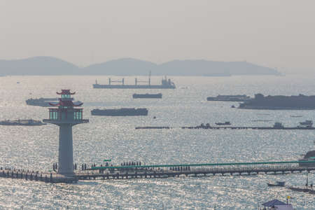 Cargo ships in the sea Waiting to dock. Mostly clear skies.