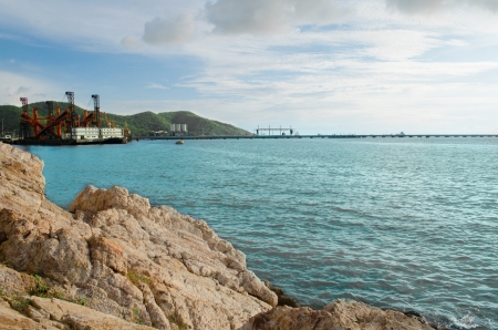 Beach rocks large Cargo ship moored in the sea side of the island.