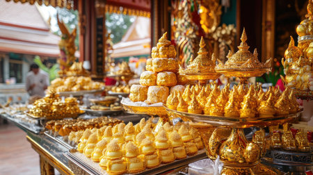 Experience the allure of traditional Thai desserts featuring intricate gold designs, perfect for cultural celebrations and festive events in a vibrant temple atmosphere.