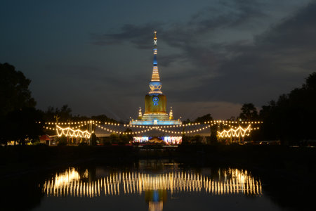 Experience the breathtaking sight of a beautifully illuminated temple at night, reflecting on tranquil waters. This serene landscape captures the essence of Thai culture and architecture, inviting viewers to embrace peace and beauty.