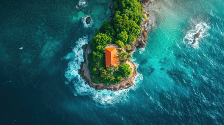 Aerial view of a beautiful tropical island with palm trees and waves.