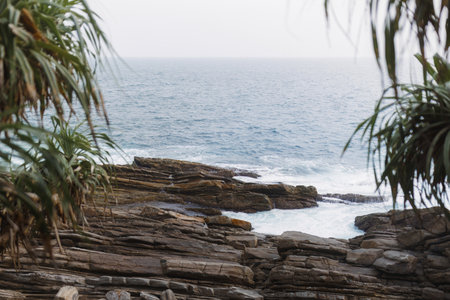 Rocky Tropical Coastline With Ocean Waves And Palm Leaves Framing View