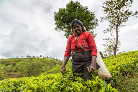 NUWARA ELIYA, SRI LANKA - FEBRUARY 15, 2020: Woman tea picker in tea plantation in Nuwara Eliya, Sri Lanka
