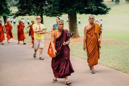 KANDI, SRI LANKA - FEBRUARY 2, 2018: Buddhist monk in traditional clothes takes selfie using smartphone