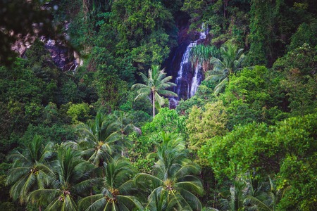 The forest waterfall in Thailand. green hills, palm groves
