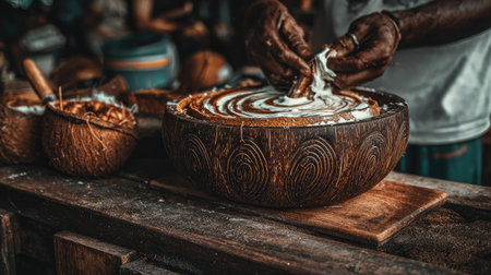 An artisan prepares a creamy dessert in a rustic wooden bowl, showcasing skillful hands mixing ingredients. The kitchen setting highlights cultural culinary traditions in a natural atmosphere.