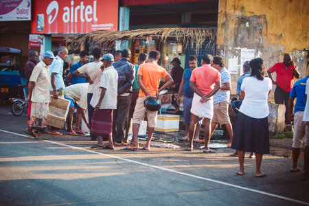 Ambalangoda, Sri Lanka - 02 February, 2017: Regular public Sri Lankan bus stop. Moring traffic in the city. People wait for the bus to work. Children students go to school