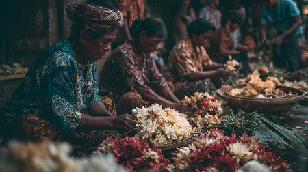 A balinese women arranging frangipani and hibiscus flower offerings in street market, warm documentary mood, cultural ritual