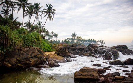 A beautiful high key tropical landscape of the ocean and rocky coastline from a headland near the beach resort village of Mirissa, Sri Lanka