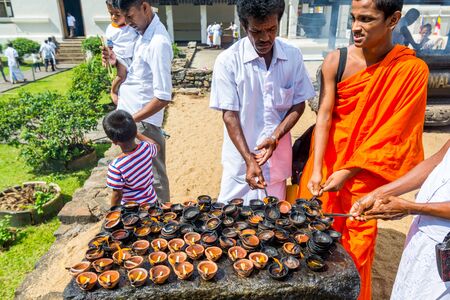 Buddhist pilgrims ligting candles into the shrine of Sri Dalada Maligawa or the Temple of the Sacred Tooth Relic, in Kandy, Sri Lanka, celebrating the Vesak day, or Buddha Jayanti, Buddha Day.