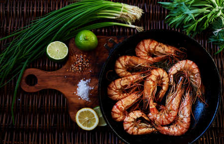 Recent large king prawns cooked in a pan, lay next to lemon and lime, rosemary and chives, Best fried shrimp appetizer to the cold beer