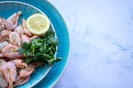 Сooked shrimp with parsley and lemon in a blue ceramic bowl on a white marble table background. Healthy Mediterranean seafood. Top view, flat lay, copy space