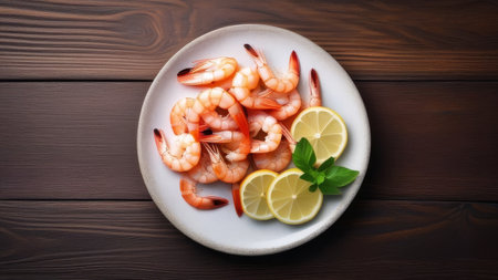 A minimalist seafood scene featuring fresh shrimp and lemon slices on a white dish, with a subtle white background.