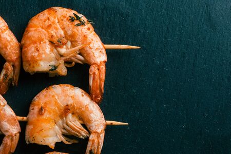Shrimps lying in a row isolated on a dark background with copy space for text. Seafood buffet in restaurant concept. Use seafood buffet for promotions. emotional burnout, suspended animation metaphor