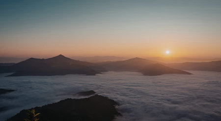 This breathtaking landscape captures the tranquil beauty of mountains shrouded in fog at dawn. Soft light fills the air, creating a serene atmosphere.