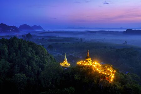 Khao Na Nai Luang Tham Park. Pagoda at sunrise on the top at Khao Na Nai Luang Dharma Park with fog. Beautiful Temple at Surat Thani province, Thailand.