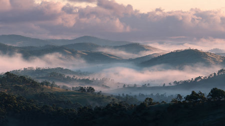 Rolling hills covered in vibrant greenery stretch into the distance, enveloped in wispy clouds as dawn breaks. The tranquil atmosphere captivates with its untouched beauty and soothing serenity.