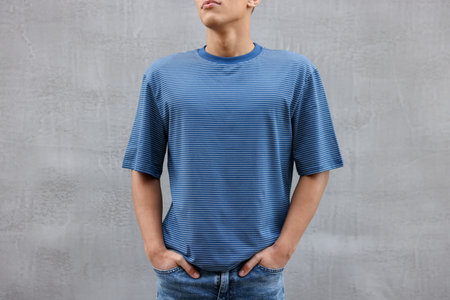 Young man wearing blank blue t-shirt near gray wall, closeup. Mockup for design