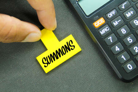 hand holding a yellow board with the word SUMMONS