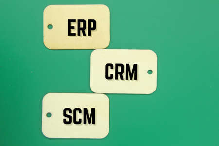 wooden tags with the letters erp crm scm. IT dan E-Learning Systems enterprise resource design