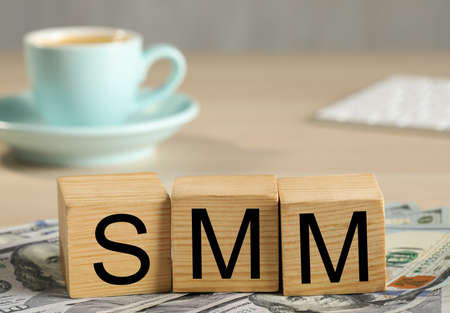 Cubes with letters SMM and dollar banknotes on wooden table