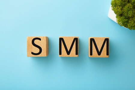 Wooden cubes with word SMM on blue background. top view.
