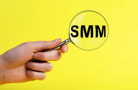 SMM word through magnifier, lens on yellow background. High quality photo