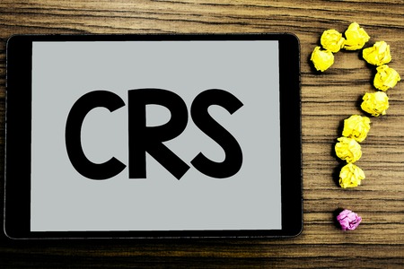 Conceptual hand writing showing Crs. Business photo showcasing Common reporting standard for sharing tax financial information written Tablet Screen wooden background Paper Ball Ask for