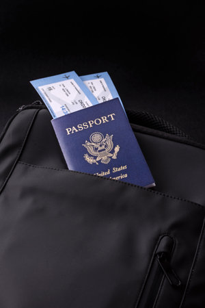 US passport, American visa for travel, document with tickets in travel bag. US passport as background for your design