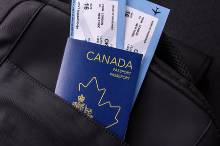 Passport Canada, visa for travel, document with tickets in travel bag. Canadian passport as background for your design