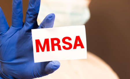 Doctor's hands in blue gloves shows the word MRSA methicillin-resistant Staphylococcus aureus. Medical concept.