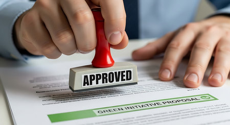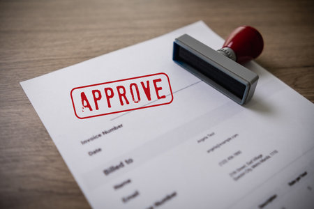 A wooden stamp with an approved message sits on a document, highlighting themes of validation and professionalism in a modern office setting.