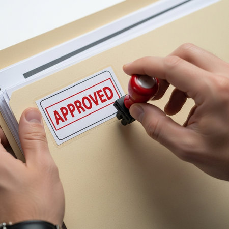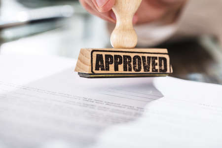 A person is stamping a stamp that says Approved on it. The stamp is on a piece of paper