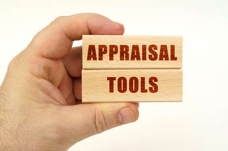 business concept. On a white background, a hand that holds wooden blocks with the inscription - Appraisal Tools