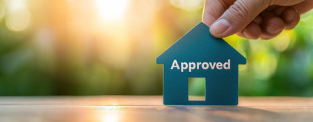 hand holding blue house shaped sign with Approved text, symbolizing success in home buying.