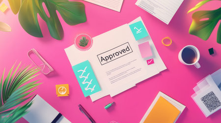 A vibrant workspace showcasing an approved document surrounded by colorful office supplies, tropical plants, and a coffee cup, creating a lively and inspiring atmosphere.