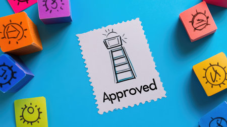 A vibrant scene featuring a playful arrangement of colorful block toys surrounding an illustrated paper stamped with Approved, perfect for educational or creative themes.