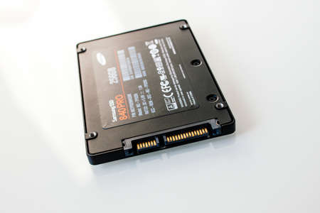 London, United Kingdom - Mar 12, 2014: Detailed close-up macro view of new Samsung SSD 840 Pro SSD Solid state drive fast data transmission disk for personal computer during upgrade