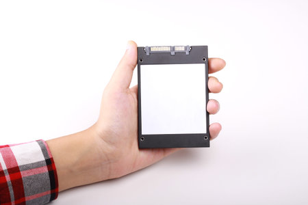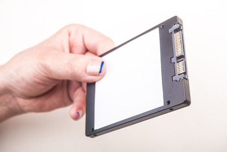 Paris, France - May 18, 2019: man hand holding new SSD Solid state drive disk from Samsung model 840 EVO 256gb fastest flash media disk - white background