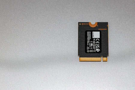NVME PCIe solid-state drive in the M.2 2230 form factor isolated on metal background.