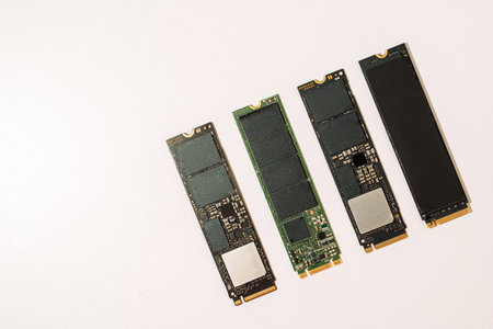 Set of M.2 NVMe SSD drives arranged diagonally on white background