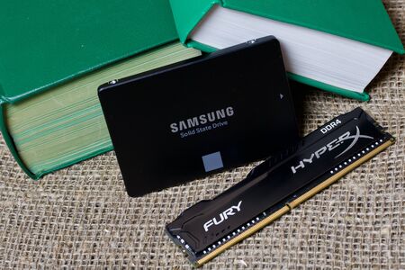 MINSK, BELARUS - NOVEMBER 25, 2019: Samsung 860 Evo 500GB SSD Hard Drive. Near RAM Bar HyperX Fury 8GB DDR4.
