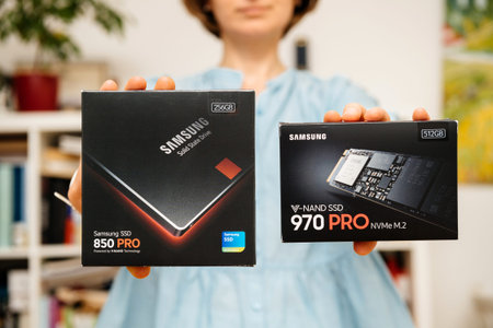 PARIS, FRANCE - AUG 3, 2018: Woman hands holding new NVME PCIE SSD hard drive disk with high read and write speed Samsung 870 Pro compare to Samsung 860 SSD
